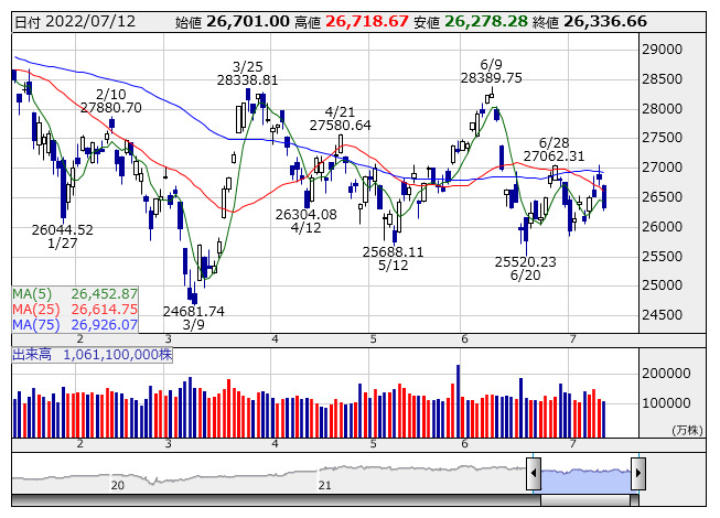 【市況】日経225先物:12日19時=変わらず、2万6280円