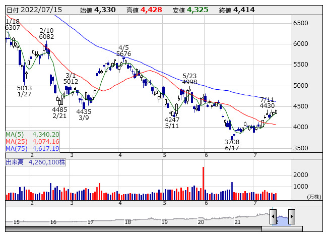 リクルート <日足> 「株探」多機能チャートより(東証上場 4129 銘柄対象[ETF、REIT含む])