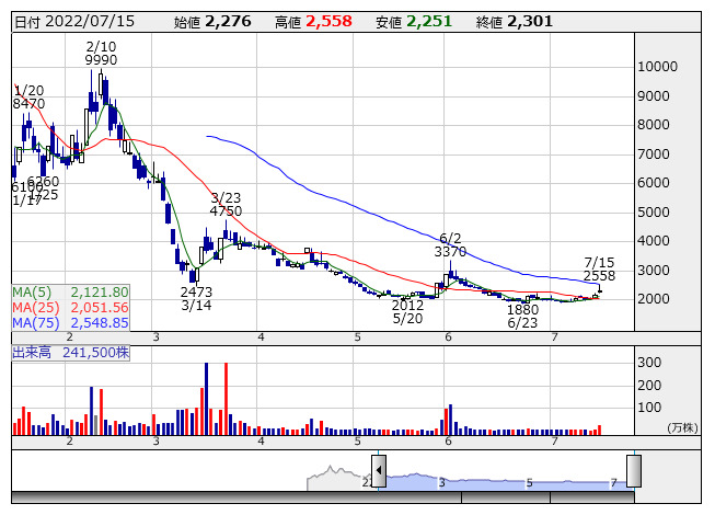ウォンテッド <3991> 2,598 +378 (+17.0%) 10,200 ( 2,649) 10,200 ( 2,649)