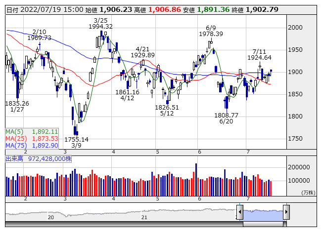 TOPIX <日足> 「株探」多機能チャートより日本取引所が公表した先物手口情報によると、7月19日のTOPIX先物期近(2022年9月限)の夜間取引(立会内・J-NETの合算)で、買い越しトップはソシエテG証券の211枚、売り越しトップはモルガンMUFG証券の138枚だった。