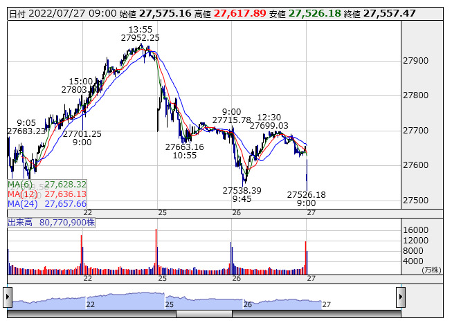 2022年07月27日09時04分 【市況】日経平均の下げ幅が100円を超える 日経平均 <5分足> 「株探」多機能チャートより 日経平均株価の下げ幅が100円を超えた。9時4分現在、129.03円安の2万7526.18円まで下落している。 株探ニュース