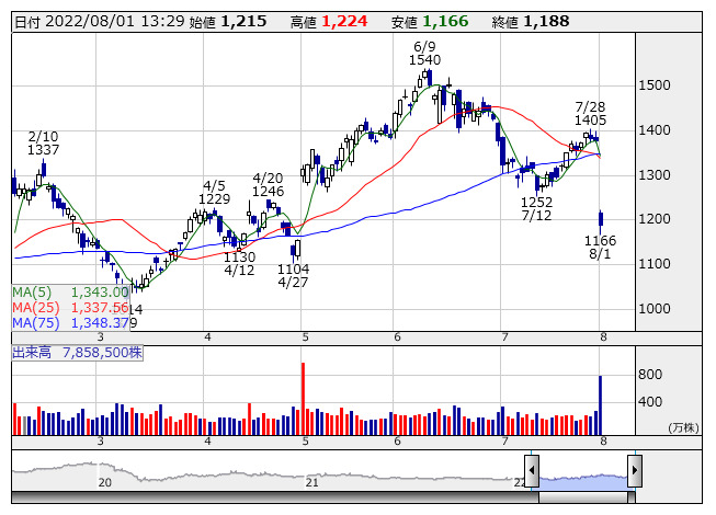 2022年08月01日13時30分 【材料】アルプスアルパイン---急落、第1四半期大幅増益も市場予想を下回る アルプスアル <日足> 「株探」多機能チャートより アルプスアルパイン<6770>は急落。先週末に第1四半期の決算を発表、営業利益は17.3億円で前年同期比3.5倍となったが、通期予想475億円に対する進捗率は低水準にとどまり、45億円程度であった市場コンセンサスも下振れている。モジュール・システム事業が原材料費上昇や物流費の高騰で赤字拡大となっており、想定比下振れの主因に。業績未達懸念などは一段と強まる状況のようだ。 《TY》 提供:フィスコ