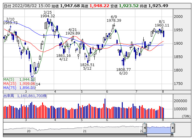 TOPIX <日足> 「株探」多機能チャートより日本取引所が公表した先物手口情報によると、8月2日のTOPIX先物期近(2022年9月限)の日中取引(立会内・J-NETの合算)で、買い越しトップはソシエテG証券の3456枚、売り越しトップはJPモルガン証券の6126枚だった。