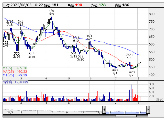 スタメン <日足> 「株探」多機能チャートより<4019> スタメン 479 +4