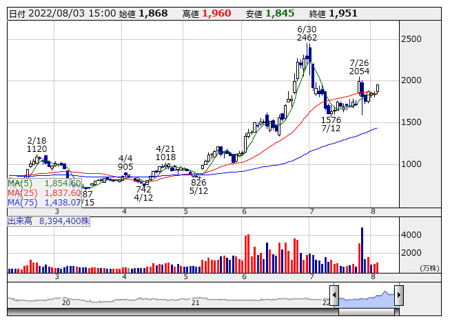 <5541> 大平洋金属 2292 +13 ( +0.6%) 2374.6 2378.6
