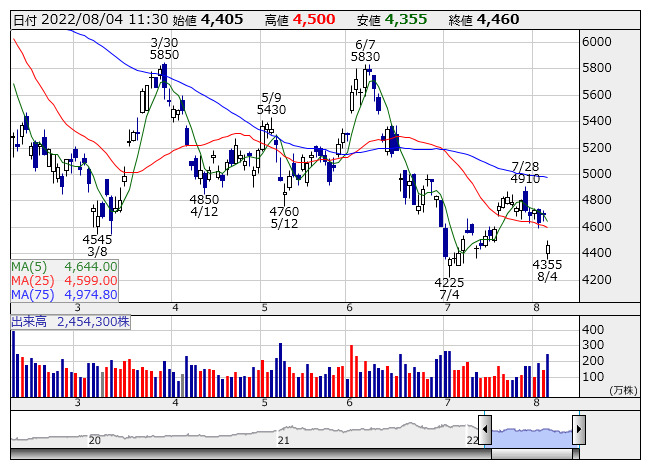 大幅反落。前日に第1四半期決算を発表、営業利益は131億円で前年同期比13.2%減となり、市場予想を20億円程度下回っている。ロックダウンの影響が大きく、中国スマホやPC向けなどが減速のもよう。業績予想は修正していないが、第2四半期は前提為替レートを134円としていることで、上半期は実質下方修正とも受け止められている。今後は自動車市場の回復なども見込まれるが、下振れ懸念は先行へ。