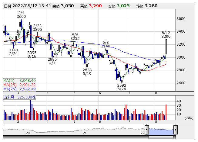 2022年08月12日13時40分 【材料】阪和興は後場急伸、取扱数量増で23年3月期業績予想を上方修正 阪和興 <日足> 「株探」多機能チャートより 阪和興業<8078>が後場に入って急伸している。同社はきょう午後1時ごろ、23年3月期通期の連結業績予想修正を発表。営業利益の見通しを従来の550億円から650億円(前期比4.2%増)に引き上げたことが好感されているようだ。 売上高の見通しも従来の2兆4000億円から2兆6000億円(同20.1%増)に上方修正。国内で鋼材をはじめとする商品価格が堅調に推移しているほか、取引先のニーズなどを把握し国内外で取り扱い数量が伸びていることが主な要因だとしている。 出所:MINKABU PRESS