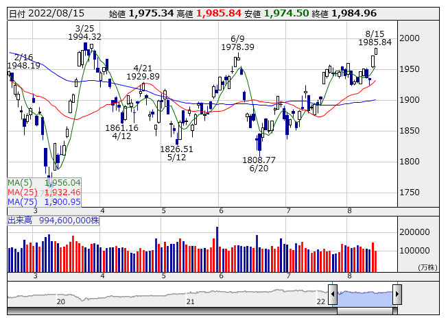 2022年08月16日08時46分 【市況】TOPIX先物:16日寄り付き=2.5ポイント安、1981.5ポイント TOPIX <日足> 「株探」多機能チャートより 16日8時45分、TOPIX先物期近2022年9月限は前日清算値比2.5ポイント安の1981.5ポイントで寄り付いた。前日のTOPIXの現物終値1984.96ポイントに対しては3.46ポイント安。夜間取引の終値1984.5ポイントに対しては3ポイント安となっている。 株探ニュース