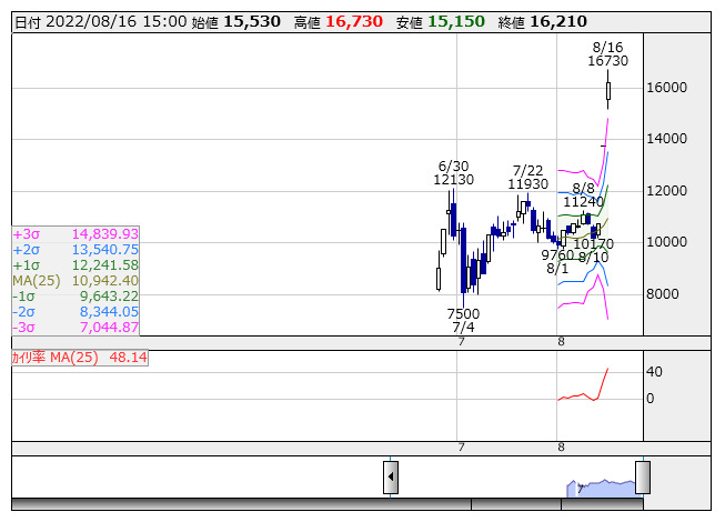 【テク】本日の【ボリンジャー|±3σブレイク】引け 上抜け= 71 銘柄 下抜け= 7 銘柄 (8月16日)