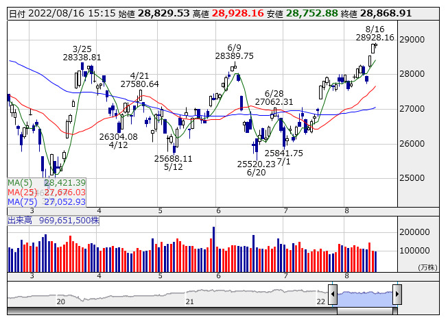 日経平均 <日足> 「株探」多機能チャートより日本取引所が公表した先物手口情報によると、8月16日の日経225先物期近(2022年9月限)の日中取引(立会内・J-NETの合算)で、買い越しトップはソシエテG証券の1684枚、売り越しトップは野村証券の1627枚だった。