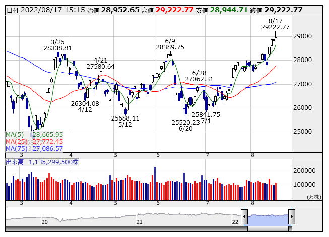 日経平均 <日足> 「株探」多機能チャートより日本取引所が公表した先物手口情報によると、8月17日の日経225ミニ期近(2022年9月限)の日中取引(立会内・J-NETの合算)で、買い越しトップはJPモルガン証券の7895枚、売り越しトップはBNPパリバ証券の3572枚だった。