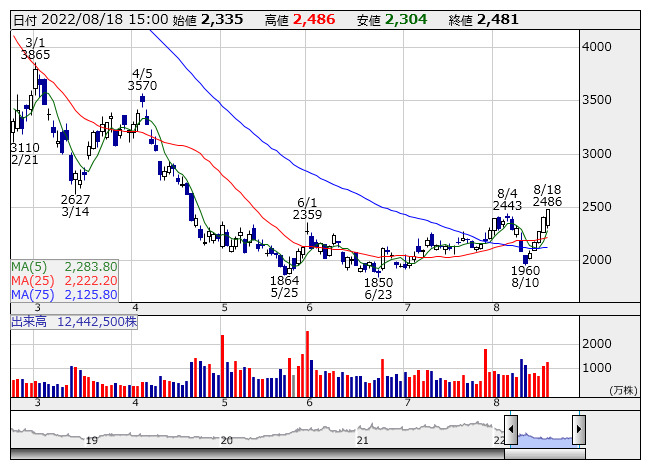<4385> メルカリ 2481 +73 ( +3.0%) 2283.8 2222.2