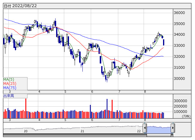 NYダウ <日足> 「株探」多機能チャートより― ダウは643ドル安と2日続落、ジャクソンホール会議を控えFRBの積極的な利上げへの警戒感から売り優勢 ―