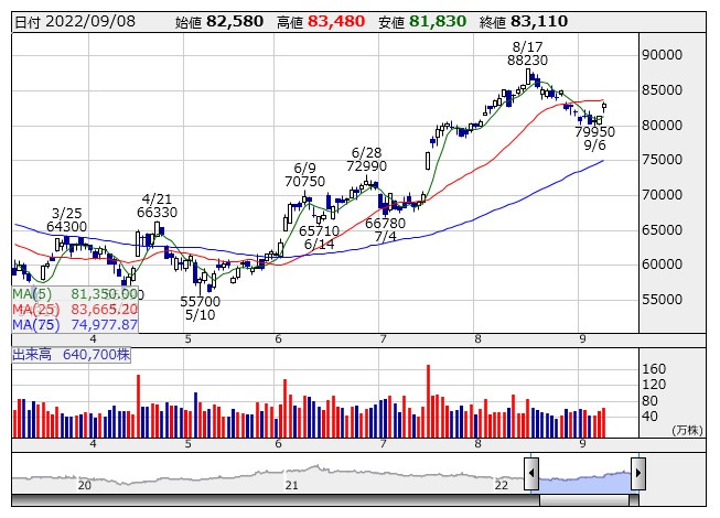 ファストリ <9983> 88,710 +5,600 ( +6.7%) 202,200 (1,793,918) 203,100 (1,801,700)
