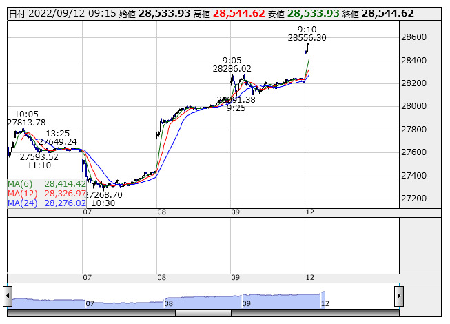日経平均 <5分足> 売買代金 「株探」多機能チャートより個別ではSimple-X NYダウジョーンズ・インデックス <1679> 、グローバルX 新成長インフラ-日本株式 <2847> 、NEXT 野村日本株高配当 <1577> 、One ETF 高配当日本株 <1494> 、NEXT ニッチトップ中小型日本株 <2050> など7銘柄が新高値。iシェアーズ 気候リスク調整世界国債 <2853> 、iシェアーズ ドイツ国債 ETF(為替ヘッジあり) <2857> が新安値をつけている。