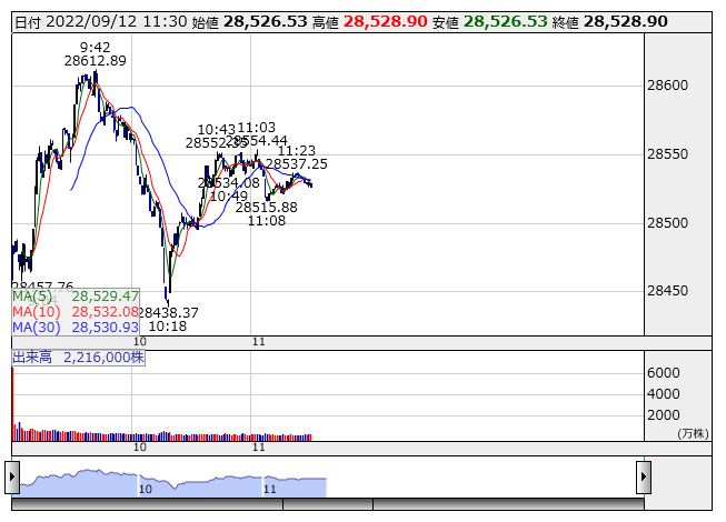 日経平均 <1分足> 「株探」多機能チャートよりきょう前場の東京株式市場は前週末の欧米株市場が全面高の様相だったことから、リスク選好の地合いが継続した。先物主導で半導体関連など値がさハイテク株が買われ、全体相場を押し上げた。日経平均は一時400円近い上昇をみせる場面もあったが、買い戻しが一巡した後は、やや伸び悩み2万8500円台で前場の取引を終えている。値上がり銘柄数は1200に届かず、全体の約3分の2にとどまった。