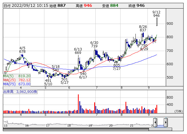 上場来高値。22年7月期の営業利益を従来予想の1.94億円から2.20億円(前期実績1.58億円)に上方修正している。ペントアップ需要などでリノベーション工事や外構・外壁工事等その他工事の受注件数が当初計画を上回る見込みとなったため。8月25日に上場来安値を記録した後は株価が底堅く推移していたことから、底打ち感も買いを後押ししているようだ。