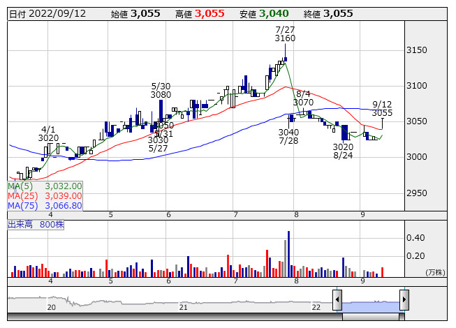 正栄食 <8079> 4,140 +160 ( +4.0%) 6,500 ( 2,694) 6,300 ( 2,608)