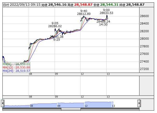 日経平均 <5分足> 売買代金 「株探」多機能チャートより個別ではNEXT 配当貴族 <2044> 、NEXTダウ・ジョーンズ工業株30種 <1546> 、NEXT インドブル <2046> 、NEXT 運輸・物流 <1628> 、NEXT 小売 <1630> など19銘柄が新高値。