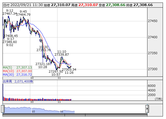 日経平均 <1分足> 「株探」多機能チャートより個別では中国H株ベア上場投信 <1573> 、NEXT 香港ハンセン・ベア <2032> が新高値。iシェアーズ 米ドル建て投資適格社債 ETF <1496> 、NEXT FUNDSFTSE世界国債 <2512> 、iシェアーズ 気候リスク調整世界国債 <2853> 、上場インデックスファンド米国債券(為替ヘッジあり) <1487> 、NEXT ブルームバーグ米国国債 為替ヘッジあり <2648> など17銘柄が新安値をつけた。