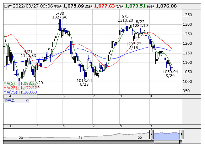 海運業 <日足> 「株探」多機能チャートより●東証33業種 値上がり: 26 業種 値下がり: 7 業種