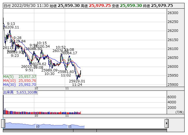 日経平均 <1分足> 「株探」多機能チャートより個別では中国H株ベア上場投信 <1573> 、NEXT 香港ハンセン・ベア <2032> 、NEXT韓国KOSPI・ベア <2034> が新高値。グローバルX テック・トップ20-日本株式 <2854> 、NEXT 電機・精密 <1625> 、NEXT FUNDSユーロ・ストックス50指数 <2859> 、iシェアーズユーロ建て投資適格社債ETF(為替ヘッジあり) <2623> 、NEXT FUNDS 国内債券・NOMURA <2510> など10銘柄が新安値をつけた。