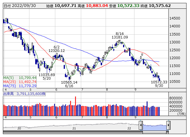 9月シカゴ購買部協会景気指数(PMI)やミシガン大学消費者信頼感指数確報値が予想を下回ったことで景気減速懸念が強まり売りが先行。長期金利の低下に伴い一時上昇に転じたが、連邦準備制度理事会(FRB)の高官が時期尚早の利上げ終了を警告したため金利先高観から売りに押された。金利も結局上昇した。また、ロシアのプーチン大統領がウクライナ4州の併合を宣言、英米が追加対ロ制裁を発表し、地政学リスクの高まりも上値を抑制した。各国中銀による政策ミスによる金融混乱への警戒感もあり、引けにかけ下げ幅を拡大。セクター別では不動産が上昇した一方で、耐久消費財・アパレルが下落した。