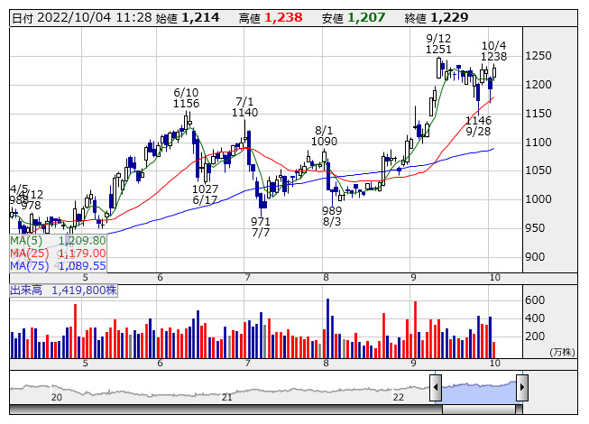 三越伊勢丹 <日足> 「株探」多機能チャートより一部店舗では台風の影響により臨時休業や営業時間の短縮などがあったものの、新型コロナウイルスの感染拡大を受けて行動制限が実施された前年の反動増があったほか、引き続き高付加価値な商品への購買意欲が高かった。三越伊勢丹の国内百貨店合計の売上高が前年同月比30.2%増となったほか、J.フロント リテイリング<3086>の大丸松坂屋百貨店合計は同22.4%増、高島屋<8233>の髙島屋各店及び国内百貨店子会社計売上高は同20.1%増、松屋<8237>の銀座本店売上高は同37.6%増、エイチ・ツー・オー リテイリング<8242>の全店売上高は同36.1%増と軒並み大幅に伸長した。