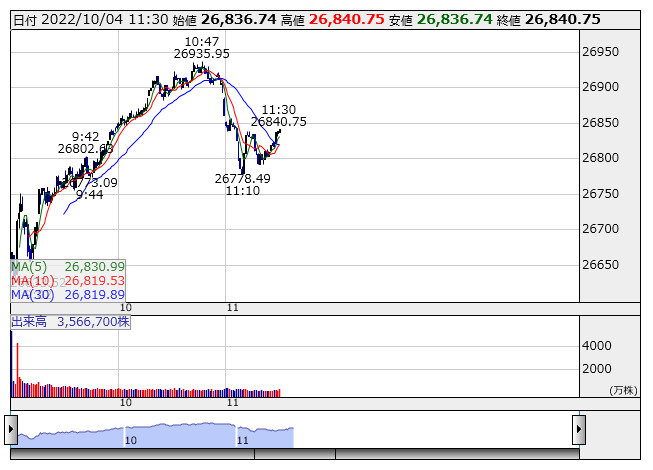 日経平均 <1分足> 「株探」多機能チャートよりきょう前場の東京株式市場は、日経平均株価が600円を超える上昇で2万6000円台後半まで一気に浮上する展開となった。取引時間中には先物主導で700円以上の上昇をみせ、2万6900円台まで水準を切り上げる場面もあった。前日の欧州株市場が全面高に買われたほか、米国株市場では長期金利低下を好感しNYダウが760ドルあまりの急反騰をみせたが、これを受けて主力株をはじめ広範囲にリスクオフの巻き戻しが加速する格好となった。値上がり銘柄数は全体の96%を占める文字通りの全面高様相となっている。