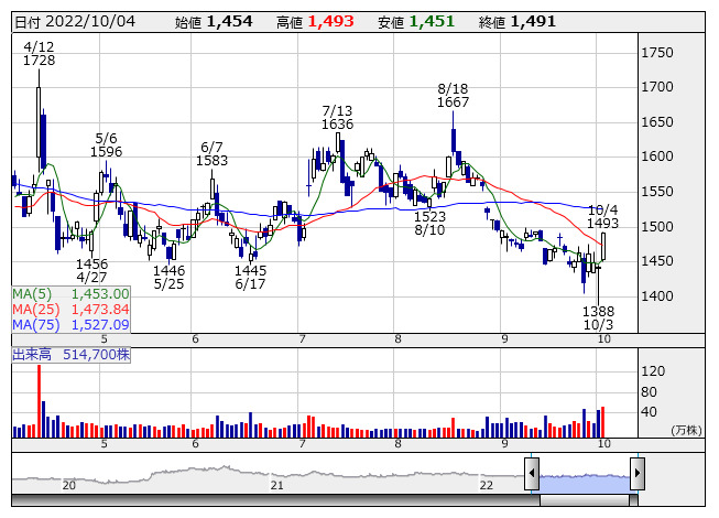 川口化 <4361> 1,380 +35 ( +2.6%) 1,600 ( 220) 2,000 ( 276)