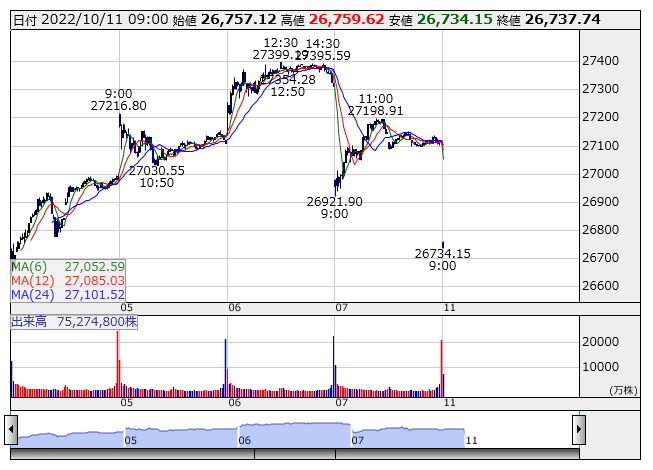 2022年10月11日09時02分 【市況】日経平均11日寄り付き=358円安、2万6757円 日経平均 <5分足> 「株探」多機能チャートより 11日の日経平均株価は前週末比358.99円安の2万6757.12円で寄り付いた。 株探ニュース
