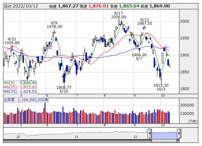 1869.00ポイント 12日TOPIX現物終値