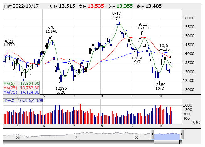 日経レバ <日足> 「株探」多機能チャートより(東証上場 4144 銘柄対象[ETF、REIT含む])