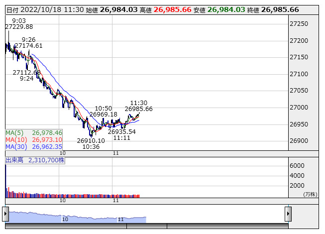 日経平均 <1分足> 「株探」多機能チャートより日経平均 : 26985.66 (+209.87)