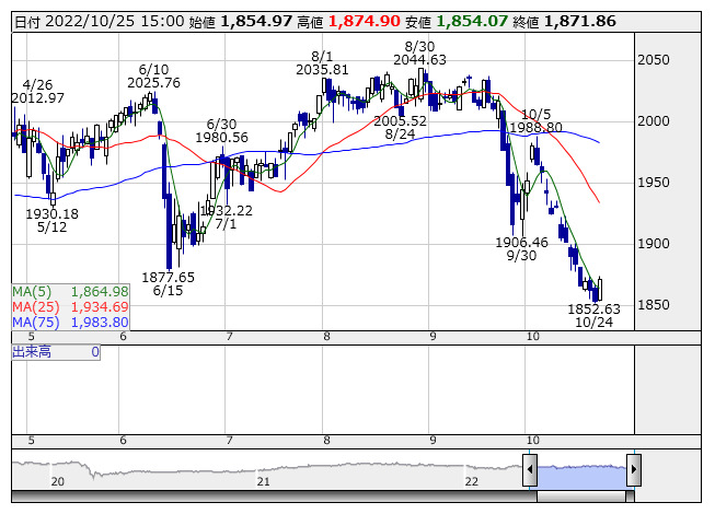 2022年10月25日15時17分 【市況】東証REIT指数先物:25日清算値=15ポイント高、1860ポイント REIT指数 <日足> 「株探」多機能チャートより 25日15時15分、東証REIT指数先物期近2022年12月限は前日清算値比15ポイント高の1860ポイントで取引を終えた。出来高は1050枚だった。この日の東証REIT指数の現物終値1871.86ポイントに対しては11.86ポイント安。 株探ニュース