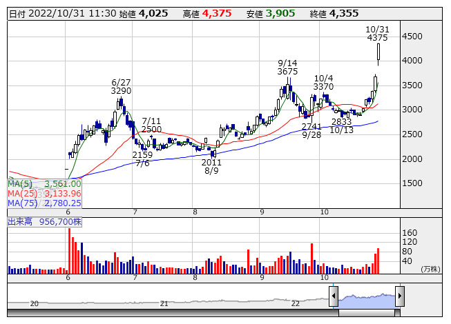 タカトリ <日足> 「株探」多機能チャートより個別ではタカトリ<6338>、ヤマト・インダストリー<7886>が一時ストップ高と値を飛ばした。北野建設<1866>、三晃金属工業<1972>、カンロ<2216>、タウンニュース社<2481>、まんだらけ<2652>など22銘柄は年初来高値を更新。リミックスポイント<3825>、田中化学研究所<4080>、ヘリオス テクノ ホールディング<6927>、アドテック プラズマ テクノロジー<6668>、enish<3667>は値上がり率上位に買われた。