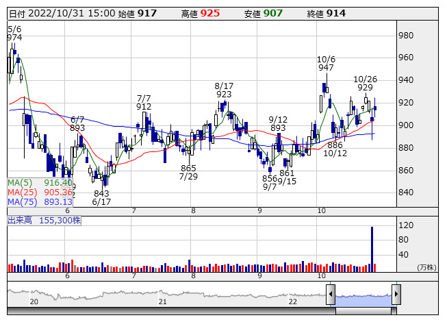中国塗 <日足> 「株探」多機能チャートより為替の円安推移による海外売り上げの押し上げや、原材料調達コストの上昇に見合った販売価格の見直しが進んでいるとともに、主力の船舶用塗料の販売が好調に推移すると見込まれることが要因としている。また、保有する投資有価証券5銘柄を下期に売却することに伴い投資有価証券売却益を特別利益として計上することや、原材料価格の上昇が一服傾向にあることなども利益を押し上げる。