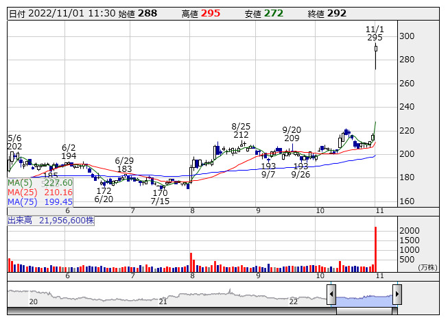 JVCケンウ <日足> 「株探」多機能チャートより●本日の株価上昇率ランキング【ベスト50】