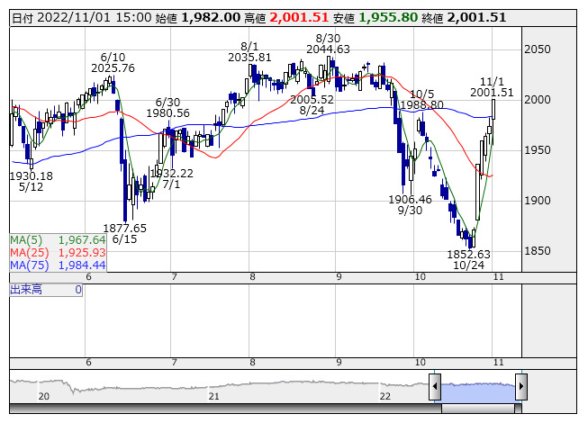 2022年11月01日15時17分 【市況】東証REIT指数先物:1日清算値=29ポイント高、1994ポイント REIT指数 <日足> 「株探」多機能チャートより 1日15時15分、東証REIT指数先物期近2022年12月限は前日清算値比29ポイント高の1994ポイントで取引を終えた。出来高は225枚だった。この日の東証REIT指数の現物終値2001.51ポイントに対しては7.51ポイント安。 株探ニュース