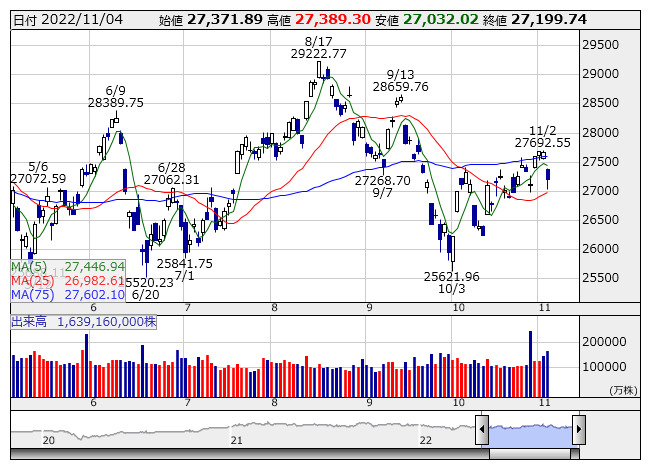 2022年11月07日06時55分 【市況】シカゴ日経平均先物 大取終値比 315円高 (11月4日) 日経平均 <日足> 「株探」多機能チャートよりシカゴ日経225先物12月限 (円建て) 27505 ( +315 ) シカゴ日経225先物12月限 (ドル建て) 27510 ( +320 ) ※( )は大阪取引所終値比 株探ニュース