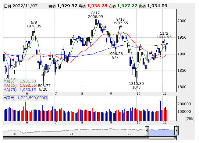 2022年11月08日08時46分 【市況】TOPIX先物:8日寄り付き=8ポイント高、1944.5ポイント TOPIX <日足> 「株探」多機能チャートより 8日8時45分、TOPIX先物期近2022年12月限は前日清算値比8ポイント高の1944.5ポイントで寄り付いた。前日のTOPIXの現物終値1934.09ポイントに対しては10.41ポイント高。夜間取引の終値1946.5ポイントに対しては2ポイント安となっている。 株探ニュース