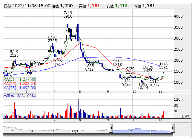 一方、pluszero<5132>が一時ストップ安と急落した。パルマ<3461>、シャノン<3976>、クリーマ<4017>、シイエヌエス<4076>、i-plug<4177>など10銘柄は年初来安値を更新。旅工房<6548>、キッズウェル・バイオ<4584>、ポート<7047>、FPパートナー<7388>、GMOリサーチ<3695>は値下がり率上位に売られた。