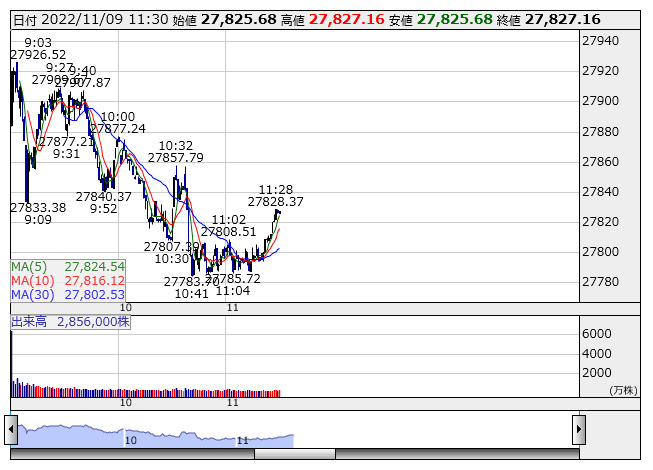 【市況】日経平均9日前引け=3日ぶり反落、44円安の2万7827円