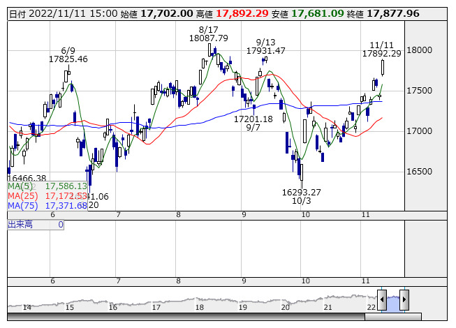 2022年11月11日15時17分 【市況】JPX日経400先物:11日清算値=430ポイント高、1万7860ポイント JPX日経400 <日足> 「株探」多機能チャートより 11日15時15分、JPX日経インデックス400先物期近2022年12月限は前日清算値比430ポイント高の1万7860ポイントで取引を終えた。出来高は1万2694枚だった。この日のJPX日経インデックス400の現物終値1万7877.96ポイントに対しては17.96ポイント安。 株探ニュース