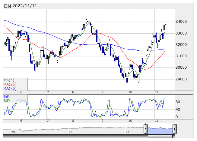 NYダウ <日足> Fastストキャス 「株探」多機能チャートより●25日線×75日線ゴールデンクロス銘柄(出来高順) ★上昇トレンドに転換した可能性が高い銘柄