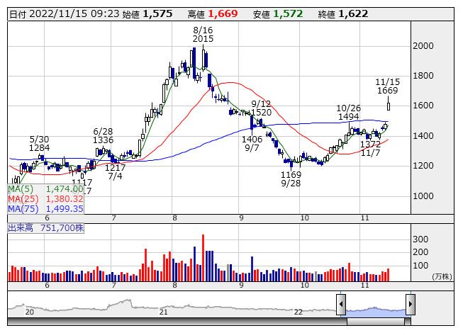 大幅に4日続伸。22年12月期の営業利益予想を従来の18.15億円から20.50億円(前期実績16.24億円)に上方修正している。米ドルと中国人民元に対する円安を反映したため。予想為替レートを1ドル=109.84円、1人民元=17.02円からそれぞれ131.89円、19.56円に変更した。第3四半期累計(22年1-9月)の営業利益は前期比23.8%減の14.94億円で着地した。中国子会社の上場申請で一時的な費用などが発生し、減益となった。