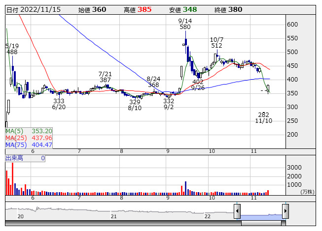 日医工 <日足> 「株探」多機能チャートより発表を受け、東京証券取引所は14日付で、日医工株を監理銘柄(確認中)に指定した。日医工株の同日終値は380円だった。2023年2月に予定する臨時株主総会で、関連する議案を付議する予定。同年3月頃に第三者割当増資を実施。上場廃止日は3~4月頃になる見込みという。