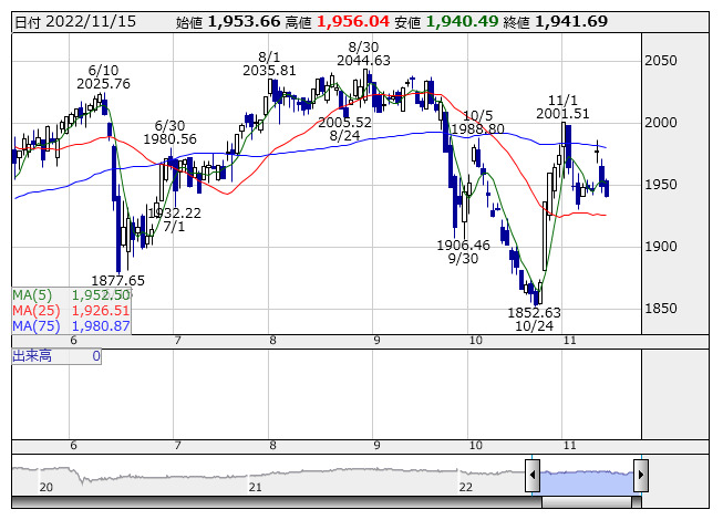 2022年11月16日08時53分 【市況】東証REIT指数先物:16日寄り付き=4.5ポイント高、1944.5ポイント REIT指数 <日足> 「株探」多機能チャートより 16日8時52分、東証REIT指数先物期近2022年12月限は前日清算値比4.5ポイント高の1944.5ポイントで寄り付いた。前日の東証REIT指数の現物終値1941.69ポイントに対しては2.81ポイント高。 株探ニュース