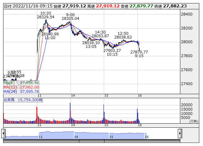 2022年11月16日09時18分 【市況】日経平均の下げ幅が100円を超える 日経平均 <5分足> 「株探」多機能チャートより 日経平均株価の下げ幅が100円を超えた。9時17分現在、110.40円安の2万7879.77円まで下落している。 株探ニュース
