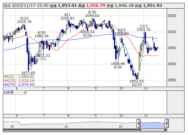 2022年11月17日15時17分 【市況】東証REIT指数先物:17日清算値=8ポイント安、1944.5ポイント REIT指数 <日足> 「株探」多機能チャートより 17日15時15分、東証REIT指数先物期近2022年12月限は前日清算値比8ポイント安の1944.5ポイントで取引を終えた。出来高は59枚だった。この日の東証REIT指数の現物終値1951.93ポイントに対しては7.43ポイント安。 株探ニュース